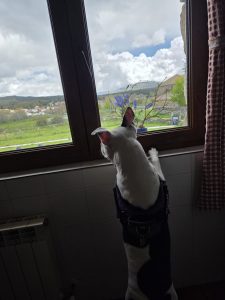 Si te está dando vértigo lo que te cuento y eres de los que prefieren quedarse en casa o en las faldas de tu dueña, como Copito, una yorkshire terrier que vino de Valladolid en enero, no te preocupes. En nuestra casa rural, hay un porche, que se puede cerrar, de manera que puedes estar al aire libre pero sin ningún peligro, más que el aburrimiento.