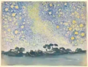 El cielo estrellado a nuestros ojos es un sin fin de puntos luminosos, por eso no extraña que Henri Edmond Cross (1856-1910) el pintor puntillista francés lo utilizara como inspiración,. En su acuarela neoimpresionista Paisaje con estrellas (1905/1908) los astros se difuminan creando un vibrante cielo azul salpicado de amarillos.