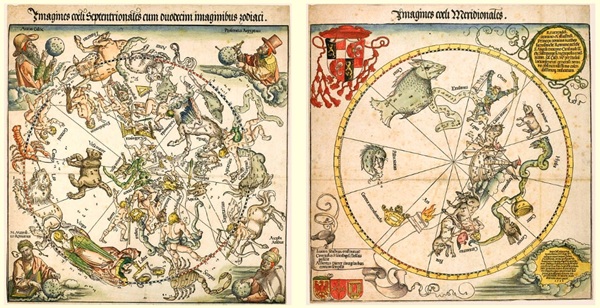 El pintor renacentista alemán se rodeó de grandes científicos, en concreto este grabado lo hizo en colaboración con los astrónomos Johannes Stabius y Conrad Heinfogel. Representan las estrellas recogidas en el catálogo estelar Almagesto de Ptolomeo, del siglo II, y sirvieron de inspiración para los cartógrafos de los siglos posteriores. En el mapa del hemisferio norte, mucho más decorado porque se tenía más conocimiento que del cielo del sur, aparecen 4 astrónomos de la antigüedad: Arato, que representa la tradición griega, Al–Sufí, la Islámica, Ptolomeo la egipcia y Marco Manilio la romana.