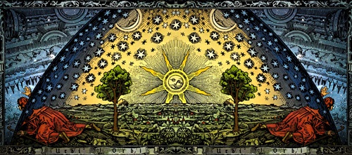 Más conocido en el ámbito astronómico es sin embargo el Grabado Flammarion, una curiosa xilografía de autor desconocido que apareció publicado, en París en 1888, en la página 163 del libro L’atmosphère: météorologie populaire, (La atmósfera: meteorología popular) del astrónomo francés Camille Flammarion. Hay muchísimas teorías sobre lo que representa, la más extendida, es que se trata de un antiguo astrónomo que ha conseguido llegar al final de la Tierra para asomarse al universo y así entender su mecanismo, una especie de maquinaria con un montón de engranajes. El pie de la ilustración lo explica así: Un misionero medieval cuenta que había encontrado el lugar en el que el Cielo y la Tierra se encontraban.