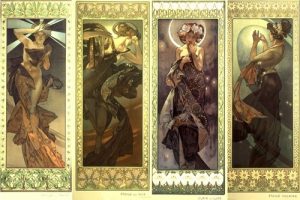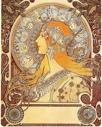 Las lineas curvas y sinuosas de los objetos celestes inspiraron también a uno de los máximos representantes del Art Noveau, Alphonse Mucha (1860-1939), pintor y artista decorativo de origen checo. Icónicas son ya sus series decorativas como La luna y las estrellas (1902) y su obra El zoodiaco (1896) en las que se entrelazan figuras femeninas idealizadas, motivos florales y astros creando el peculiar lenguaje poético propio del Modernismo. Mucha diseñó objetos cotidianos como sellos, cajas de galletas, jabones, joyas, etc. y vistosos carteles publicitarios.